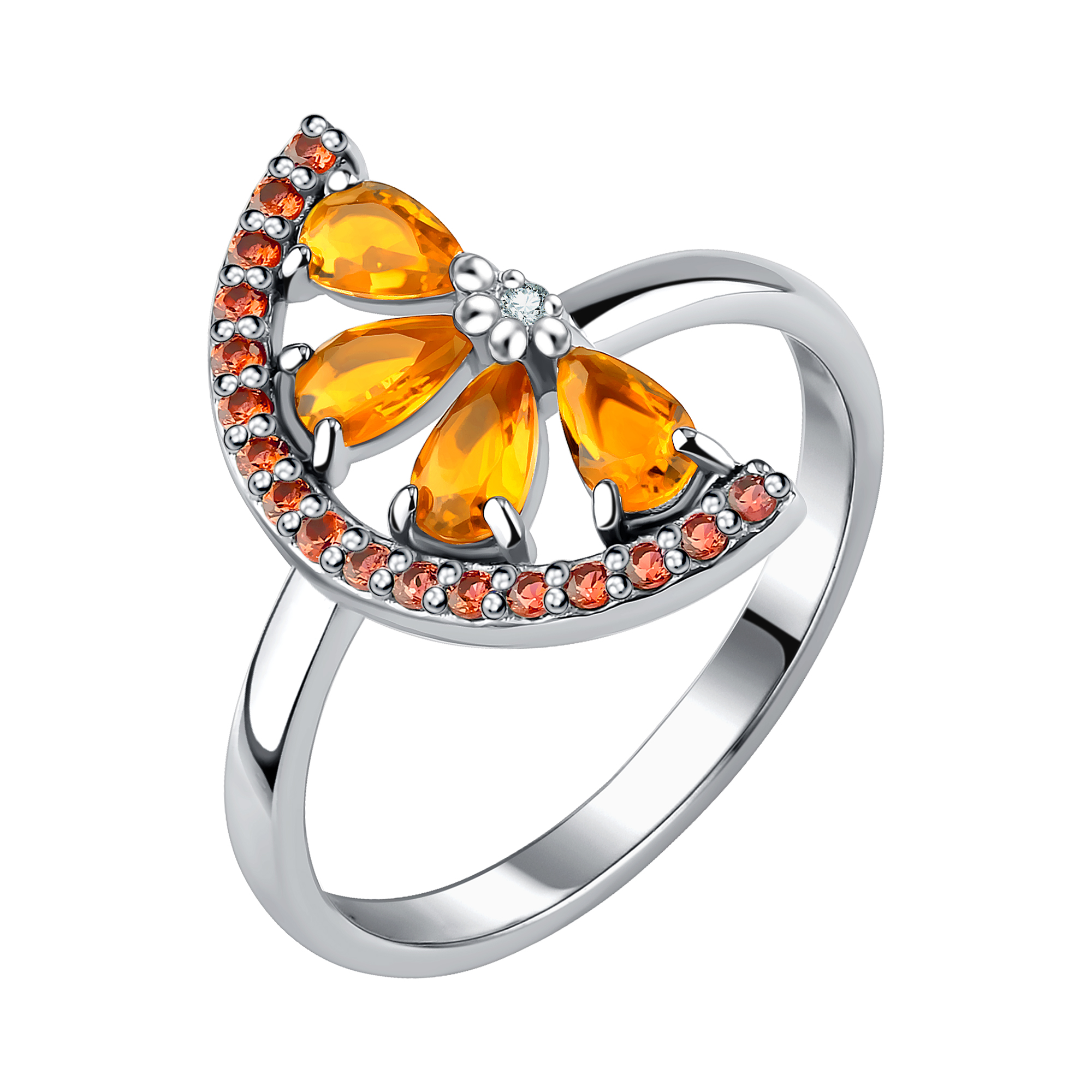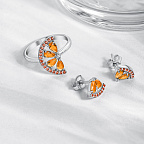 Кольцо с декоративным элементом в виде дольки апельсина из родированного серебра 925 пробы с фианитами. Вставки: оранжевый фианит огранки груша 5*3 мм. 4 шт., оранжевый фианит огранки круг 1,25 мм. 17 шт., бесцветный фианит огранки круг 1,25 мм. 1 шт. Украшения в виде фруктов - целая серия изделий в нашей новой коллекции: арбузные дольки из ярких фианитов, позолоченные бананы, сочные клубнички с эмалью и не только. Они создают теплое настроение и дарят радость. Смело миксуйте украшения из разных комплектов между собой и создавайте свой собственный летний стиль. Изящное женское серебряное кольцо станет отличным дополнением к любому повседневному и вечернему образу. Ювелирное украшение - замечательный подарок любимой девушке, маме. Кольцо станет отличным дополнением к комплекту из серебряных украшений. Изделие будет прекрасно смотреться на руке девушки, подчеркивая её красоту и изящество.